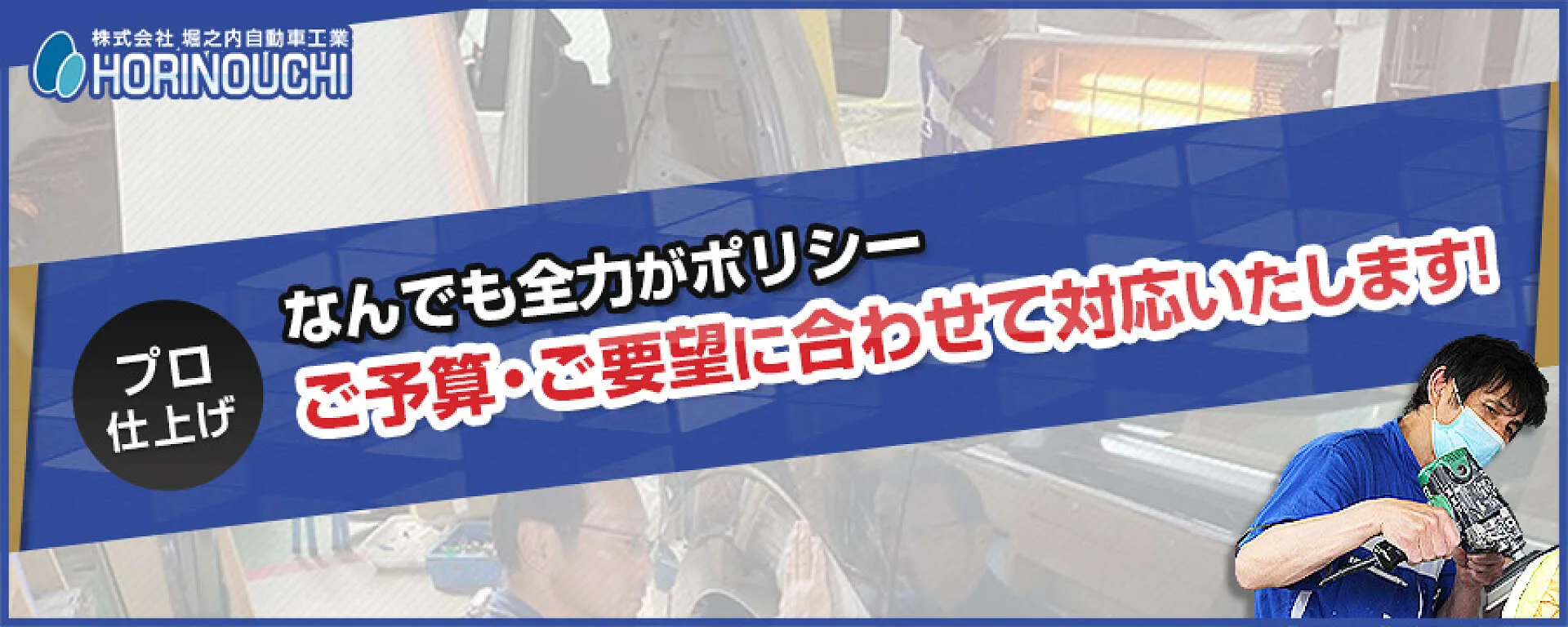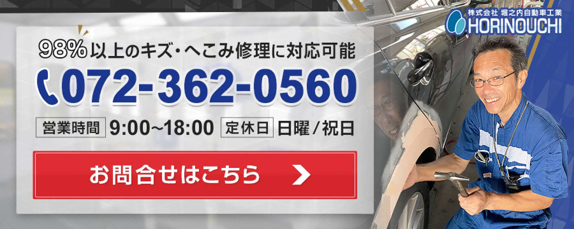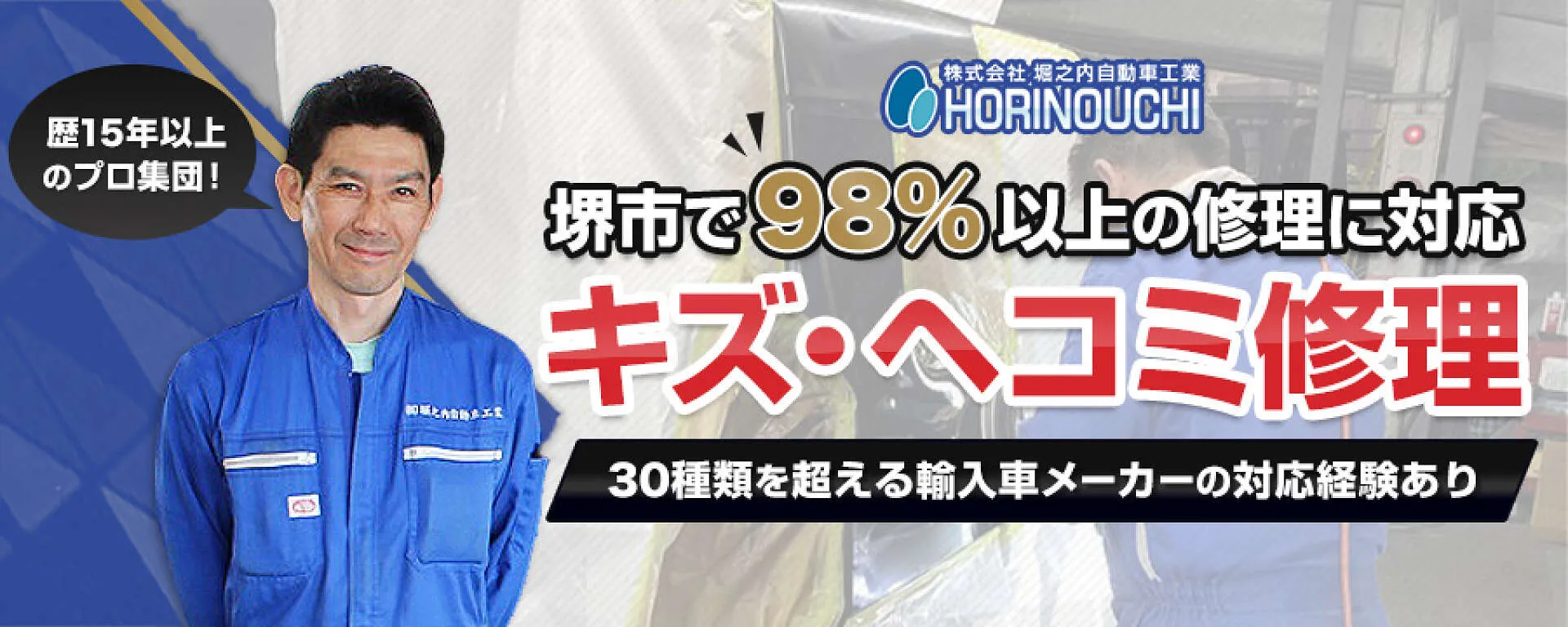 堺市美原区にある堀之内自動車工業では、国産車から輸入車まで幅広い車種のキズ・ヘコミ修理にご対応いたします。鈑金塗装のご相談はご新規さまでもお気軽にご相談ください。