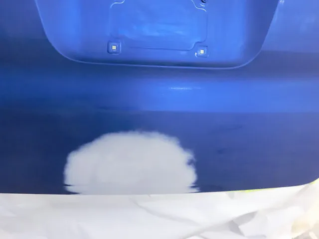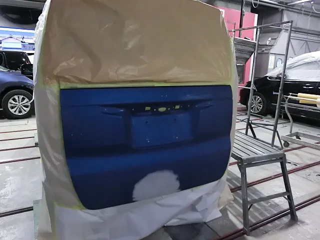 まずは修理箇所以外をしっかりマスキングして、塗装していきます。塗料を何回か塗り重ねる事で、本来の色に染めていきます。この時に使用する塗料を「カラーベース」といって、カラーベースを塗った後、最後にぼかすように全体になじませます。その後は乾燥させて、最後にトップコートである「クリアー塗装」をしていきます。塗装をしたら乾燥、塗り重ねたらまた乾燥させて・・と長い時間がかかる作業なんです。この手間をかけることによって、綺麗に仕上がるんですよね。
