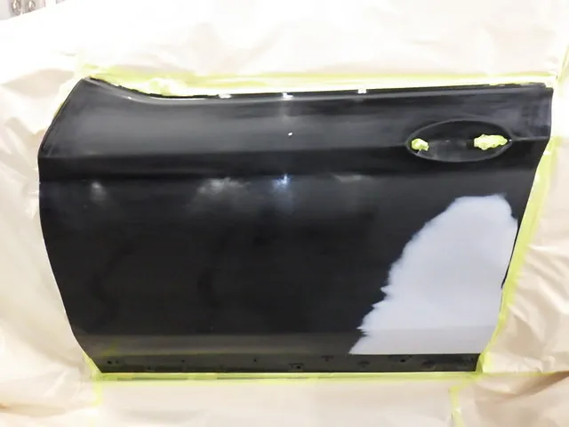 まずはフロントフェンダー、フロントドアをはずして修理していきます。ヘコミ部分は叩いて引き出し、削ります。その後パテで成型(下地処理)を行います。そして周りとなじむように広範囲に下地処理をしていきます。ここで手を抜いてしまうと仕上がりがデコボコになったり、仕上がりに差がでてくるので、丁寧に下地処理をしていきます。
