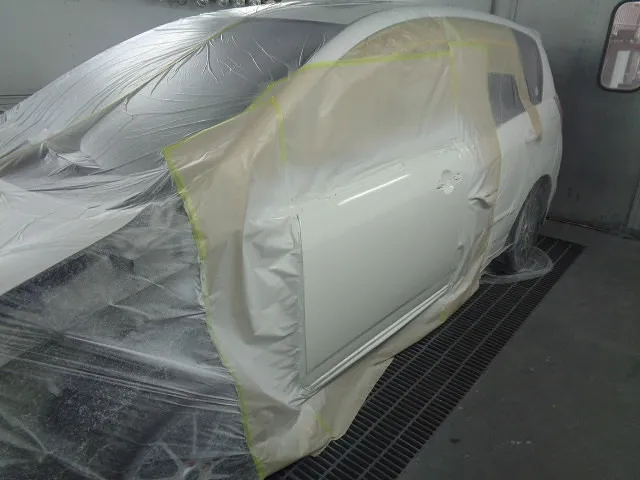 下地処理が終われば塗装ブースで塗装していきます。塗装する箇所以外に塗料がつかないように、しっかりマスキングをします。塗料を何回か塗り重ねることによって、元々の色に近づけていきます。塗装は基本的に、塗装をしたら乾燥させてまた塗装して…という作業を丁寧に繰り返します。