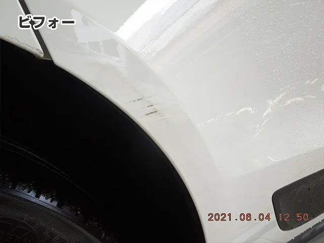 細かいキズがなくなってキレイになりました。白いボディなのでキズが目立っていましたが、これでまた楽しいカーライフをお送りできますね。