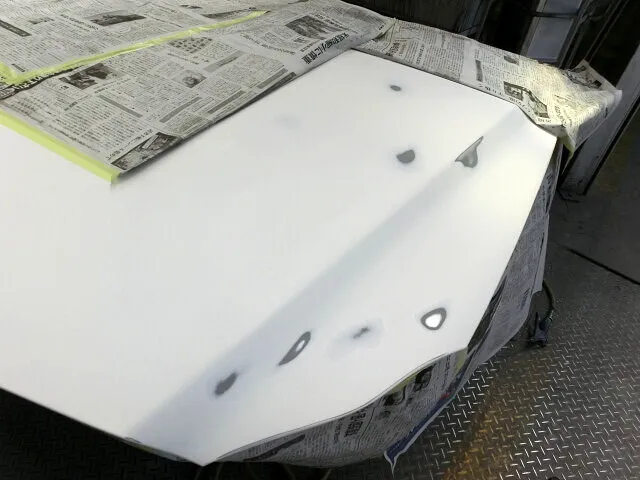 ボンネットに複数のキズができてしまっていました。小さいキズですが、白い車体なので目立ちやすいですよね。早速、ボンネットを脱着して鈑金塗装でキズ修理をしていきます。