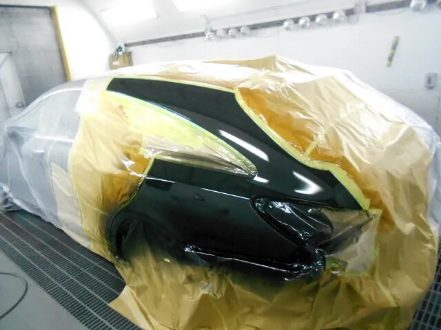 塗装に入る前に、まず重要な工程である下地処理を行います。塗装の仕上がりのキレイさは、丁寧な下地処理が何よりも肝心。下地処理が終わったらいよいよ塗装に入ります。修理箇所以外に塗料がつかないようにしっかりマスキング。