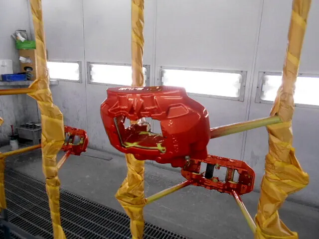 ブレーキキャリパーの種類にもよりますが、ブレーキキャリパー本体表面がフラットの場合は表面研磨の後、ペイントになります。表面がエンボスの場合は4の加工の後に、サフェーサー(下塗り)塗布した後にペイントになります。