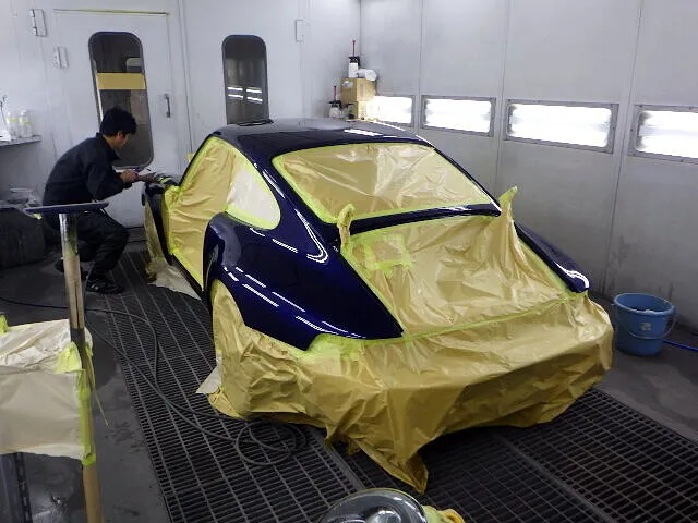 お客様のご希望で艶出しのプロテクションフィルムを施工いたします。ピカピカな仕上がり、楽しみですね。パーツのばらしが終わったら、コーティングをしない部分にしっかりマスキング。そして、液剤をスプレーで丁寧に塗り重ねていきます。