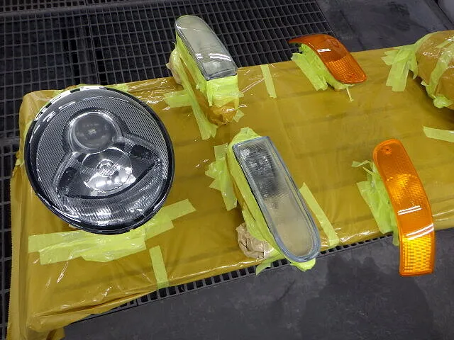 当店のHPからお問合せいただきました。ありがとうございます。施行箇所は、ボディ本体、左右ヘッドライト、左右ミラーハウジングです。まずはパーツをばらしていきます。