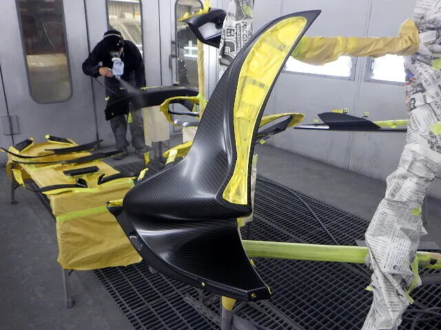 まずは、パーツをばらしてからコーティングをしない部分にはしっかりとマスキング。続いて、特殊な液剤をスプレーで丁寧に塗り重ねます。これが最終的にフィルムになるんですね。一般的なコーティングよりも厚みがあるので、その分光沢や保護性能がケタ違い。
