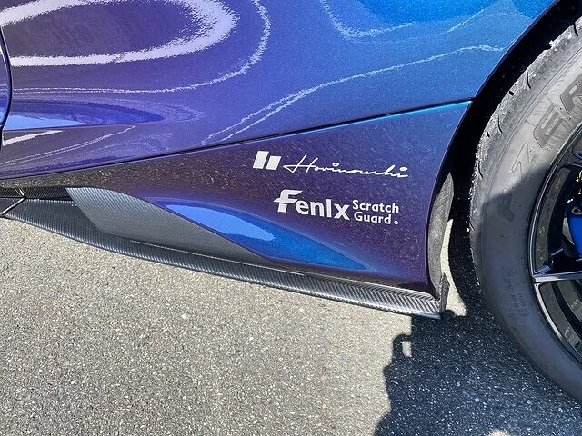 こちらは鈴鹿サーキットのときのお写真です。光沢感によって偏光カラーのようなキレイな青色になりました!理想通りの色でお客様にも喜んでいただいたので嬉しく思います。プロテクションフィルムは、通常のコーティングより分厚いのが特徴。雨シミや小傷などの経年劣化からボディを守り、美しい外観がより長持ちします。劣化したら剥がして張り替えることもできますので、その際にはまたぜひご相談ください。